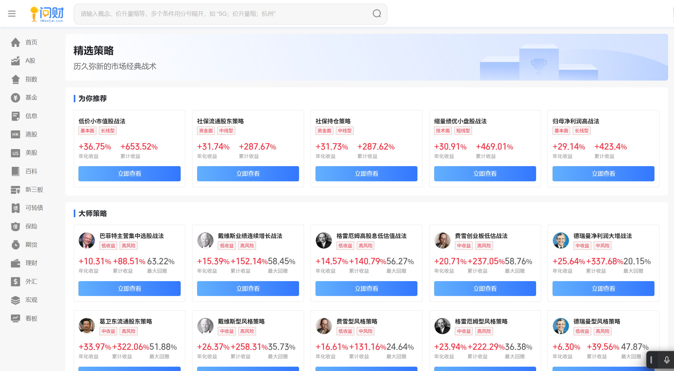问财内置“精选策略”模块,提供各类常见选股思路,如基本面优选、资金驱动